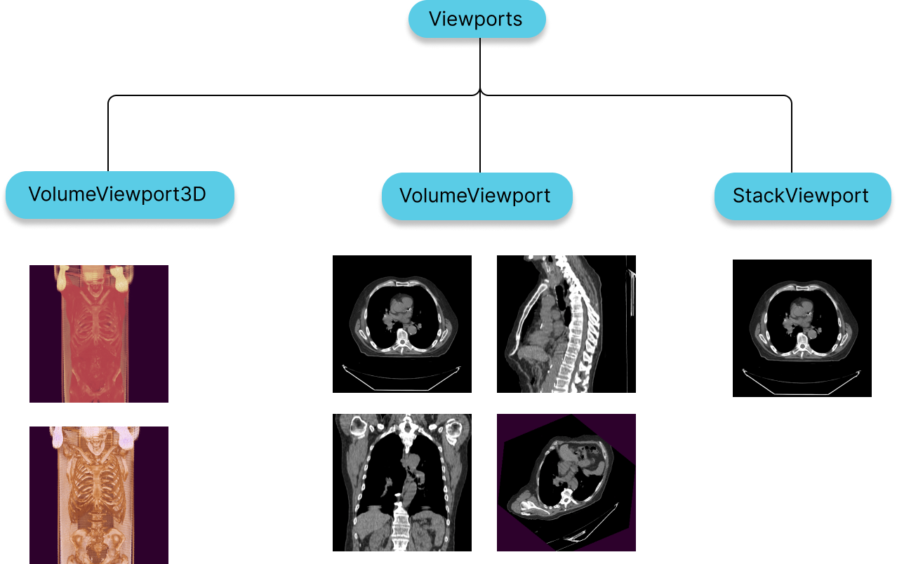 - Having a VolumeViewport enables Multi-planar reformation or reconstruction (MPR) by design, in which you can visualize the volume from various different orientations without addition of performance costs.